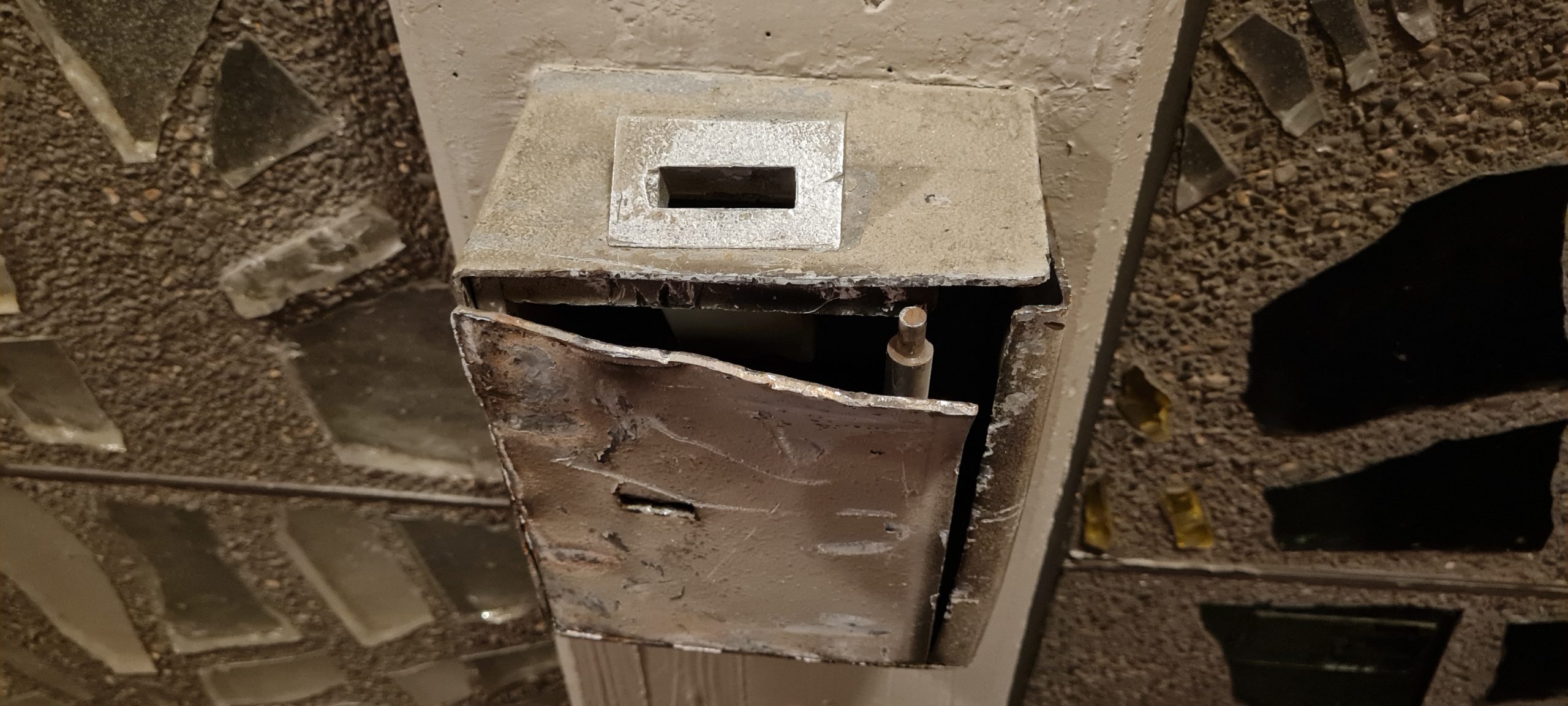 Titelfoto: Aufgebrochener Opferkasten am Schriftenstand