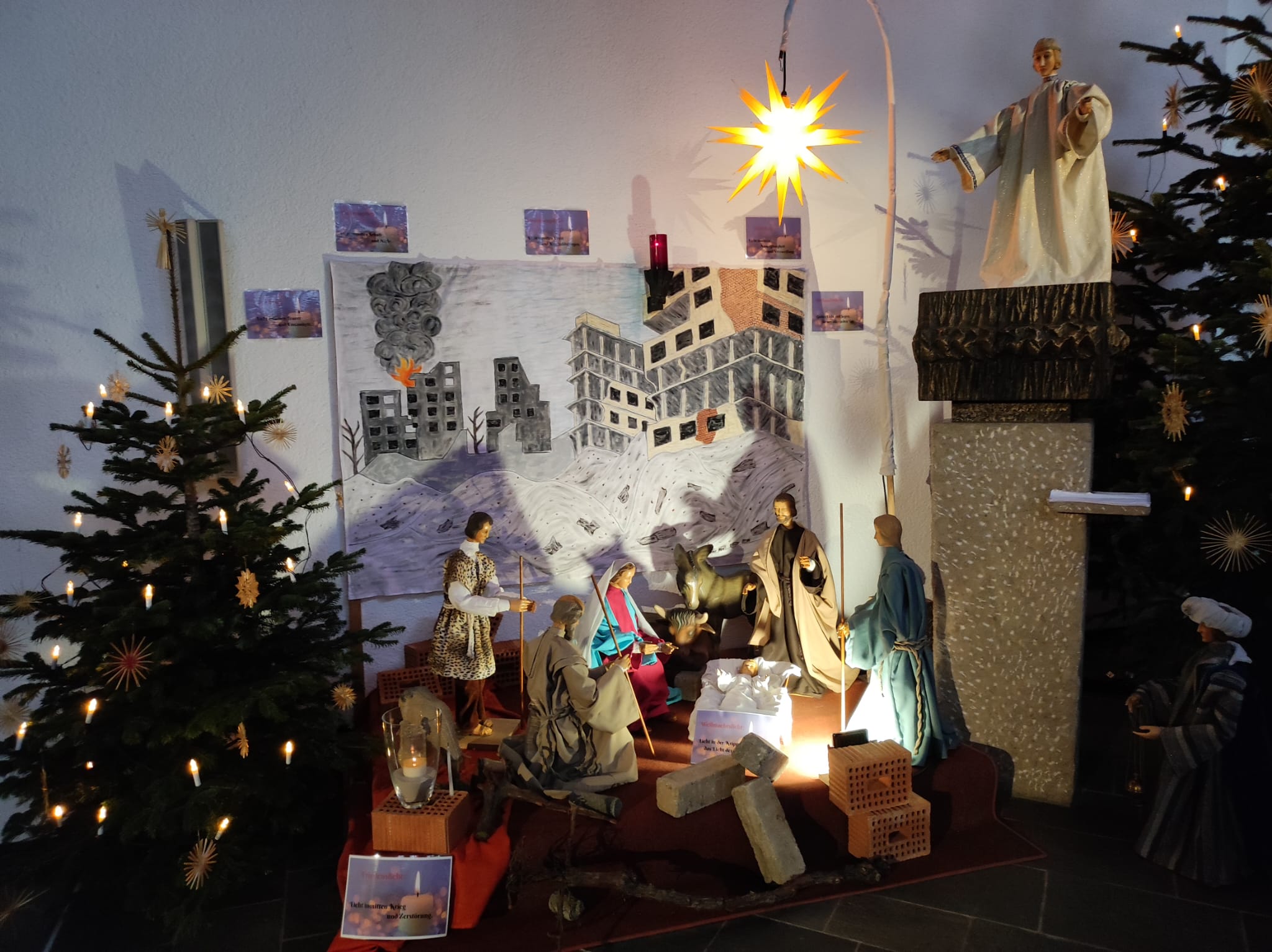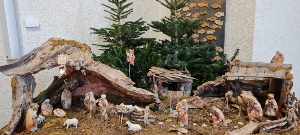 Die diesjährige Krippe in Pfullingen – gemalt vom Gewählten KGR-Vorsitzenden Karl-Martin Schwarz – steht vor einer Kulisse aus Zerstörung und Leid. Im Mittelpunkt jedoch leuchtet das Kind in der Krippe als Zeichen der Hoffnung. Dieses Licht schenkt Trost, ermutigt zum Frieden. Diese Hoffnung lädt dazu ein, an Frieden zu glauben und den Blick nach vorne zur richten. Gerne können unsere Krippen in den Kirchen St. Wolfgang Pfullingen und Hl. Bruder Konrad Lichtenstein-Unterhausen besucht und bestaunt werden; die Kirchen sind – wie auch sonst über das ganze Jahr hinweg – tagsüber geöffnet.